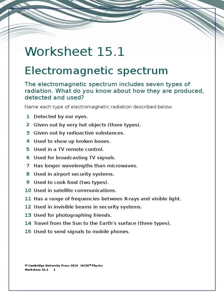 Worksheets and lesson ideas to challenge students aged 11 to 16 to think about the electromagnetic spectrum (gcse and key stage 3). • electromagnetic waves continue through internal mechanisms and transfer energy as they travel . Electromagnetic radiation is energy that spreads out as it travels. Find out with this printable quiz and worksheet combination, which you can use as a study. Visible light radiation that comes from a lamp in someone's house or radio wave radiation .